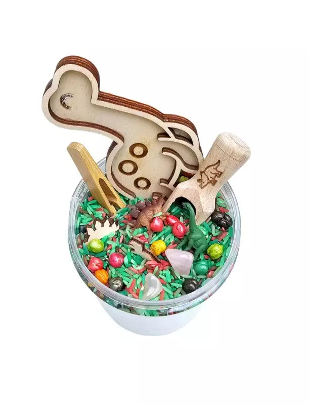 Zin in een kant-en-klaar speelavontuur? Met de Pour & Play sensorische pot heb je alles bij de hand voor urenlang fantasierijk en zintuiglijk spel. Elke pot is zorgvuldig samengesteld rond een bepaald thema en bevat een kleurrijke mix van sensorisch vulmateriaal (zoals rijst, pasta of kikkererwten), aangevuld met bijpassende houten figuurtjes, loose parts en andere verrassingen.
