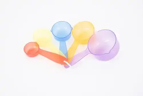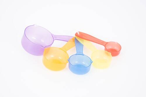Set bestaat uit 5 maatscheppen in 5 kleuren. (1 kopje (236 ml), 1/2 kopje (118 ml), 1/3 kopje (79 ml), 1/4 kopje (59 ml) en 1/8 kopje (29,5 ml).