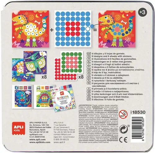 Verpakt in een stevige metalen doos met vrolijk APLI Kids design – niet alleen aantrekkelijk, maar ook praktisch om alles netjes in te bewaren.
