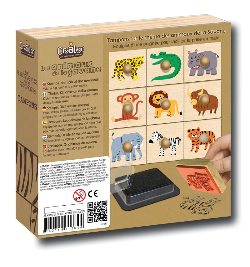 De stempels zijn gezeefdrukt en voorzien van een handvat, zodat kinderen ze makkelijk kunnen vasthouden en gebruiken. Zo bouwen ze hun eigen savannelandschap, verzinnen verhalen en ontwikkelen spelenderwijs hun fijne motoriek.
