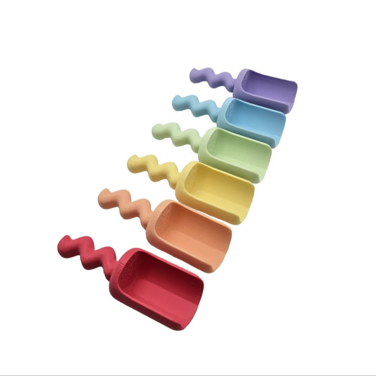 Met het herkenbare golfpatroon schep je eenvoudig zand, rijst of andere materialen. Erg geliefd bij kinderen door het fijne formaat én bij ouders door het stijlvolle design.