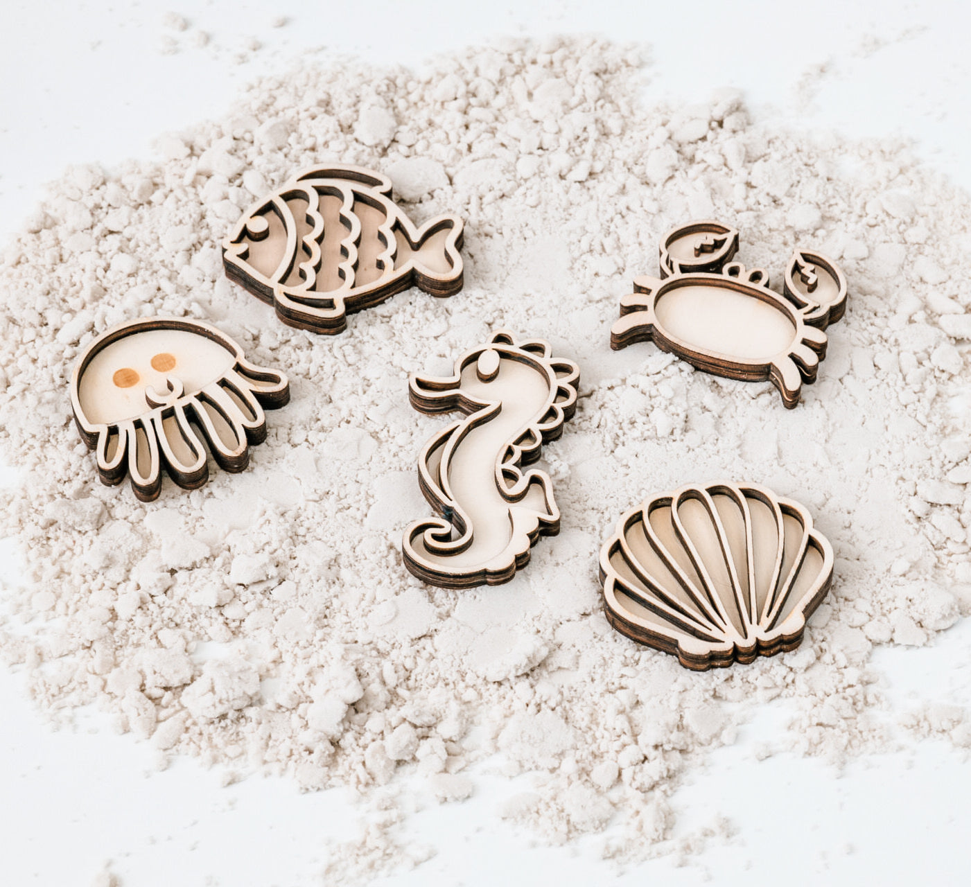 Laat je kind de vormen vullen met rijst, sensorische parels of andere natuurlijke materialen, of gebruik ze om mooie afdrukken te maken in kinetisch zand of klei. Zo stimuleer je spelenderwijs de fijne motoriek, concentratie en zintuiglijke ontwikkeling.