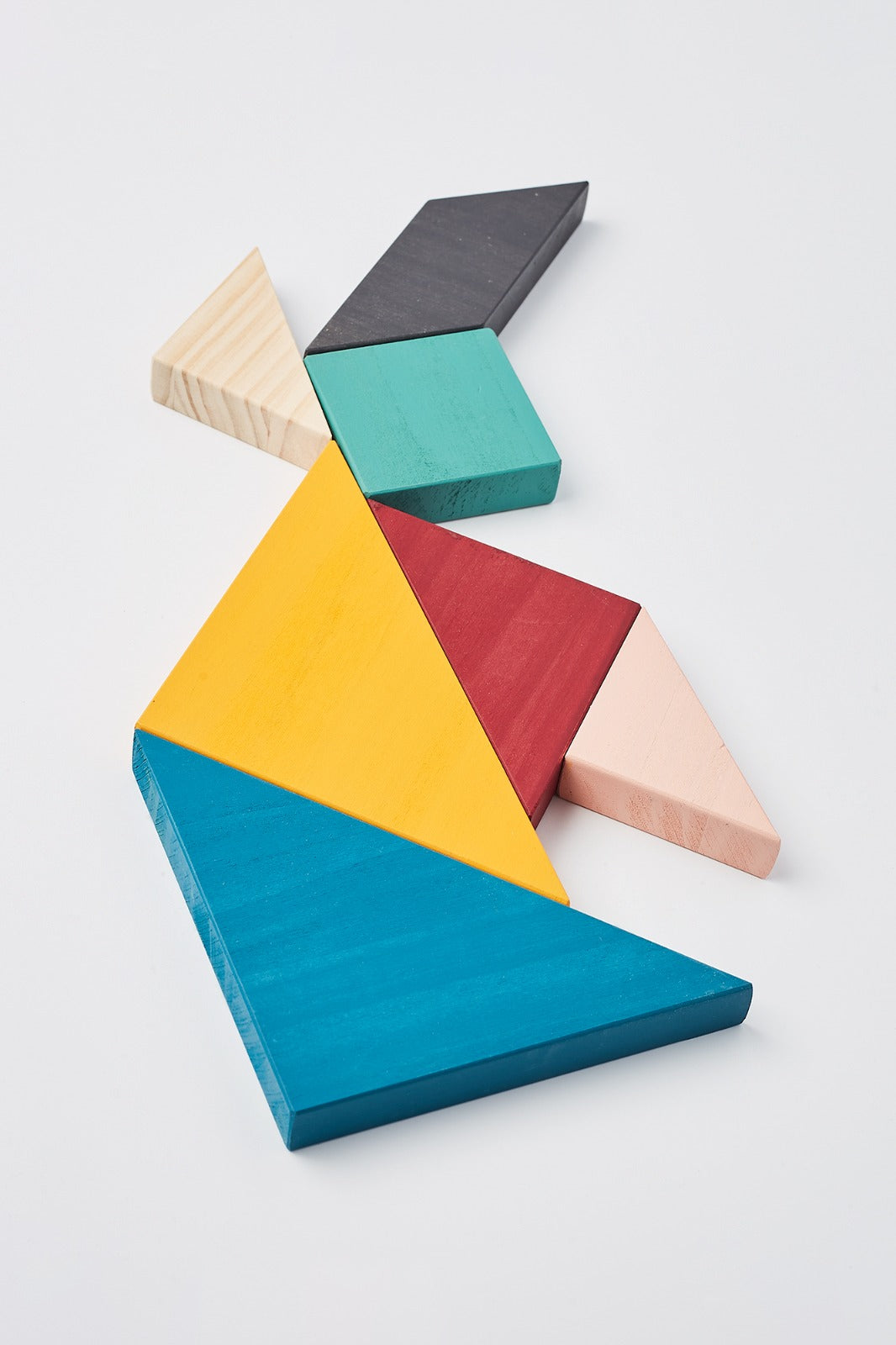 Houten Tangram van hout waarmee kinderen oneindig veel figuren kunnen maken naar eigen fantasie en creatie. Maar natuurlijk ook kunnen bouwen.