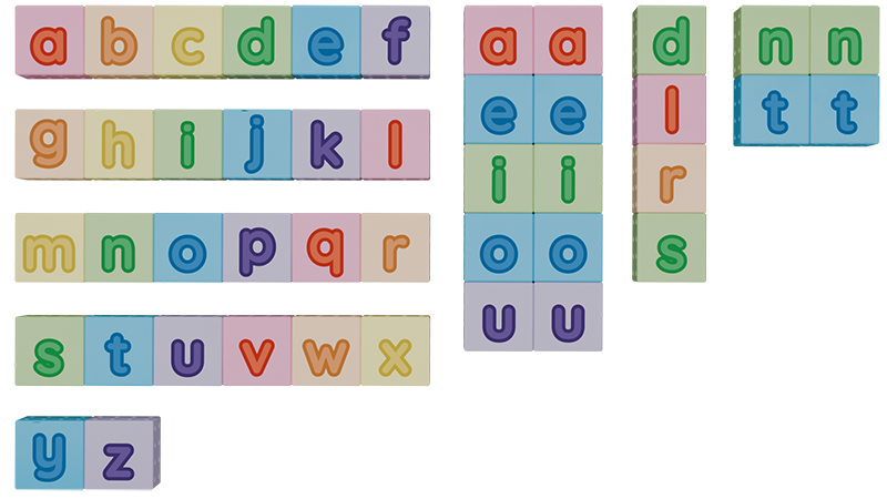 De set bevat het volledige alfabet in kleine letters, aangevuld met extra klinkers en veelgebruikte medeklinkers. Hierdoor kunnen kinderen makkelijker woorden maken en oefenen met lezen en spellen. De zes zachte pastelkleuren zorgen voor een rustige, aantrekkelijke uitstraling die perfect past in een moderne speel- of leeromgeving.