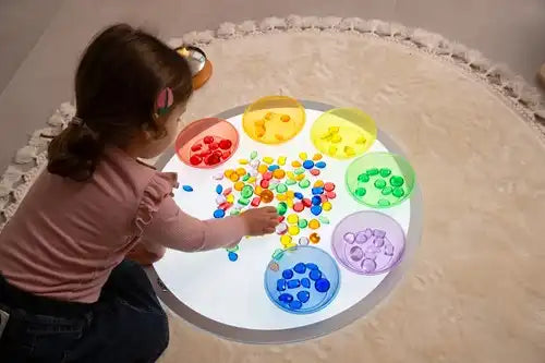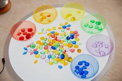 De doorschijnende eigenschappen maken ze ideaal voor gebruik met een lichtpaneel om de verbeelding van uw kind te prikkelen en kleuren en de voelbare markeringen op elke vorm te verkennen.