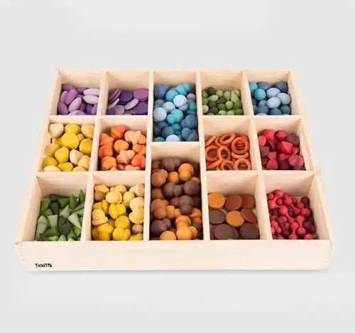 Een compacte en opgeruimde opbergoplossing waarmee je kind voorwerpen op kleur of vorm kan sorteren en tentoonstellen. Perfect te combineren met diverse loose parts.
