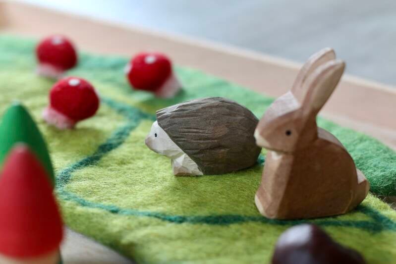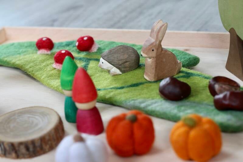 Producten: speelmat paddenstoelen (Papoose Toys), houten egel (Wudimals), houten konijn (Ostheimer), kabouters (Grapat), vilten pompoenen (Mkiddiezz)
