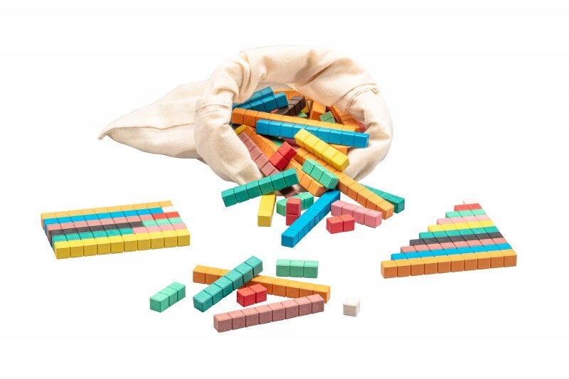 - 36 x één wit (1x1x1 cm), 18 x twee rood (2x1x1 cm), 18 x drie groen (3x1x1 cm), 12 x vier roze (4x1x1 cm), 8 x vijf geel (5x1x1 cm), 6 x zes donkergroen (6x1x1 cm), 6 x zeven zwart (7x1x1 cm), 6 x acht bruin (8x1x1 cm), 6 x negen blauw (9x1x1 cm), 10 x tien oranje (10x1x1 cm).