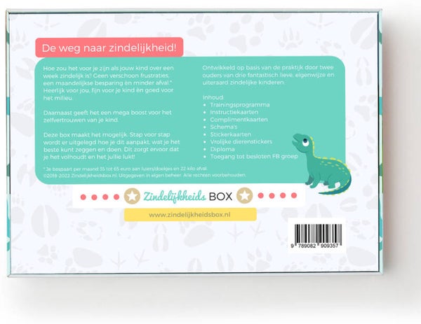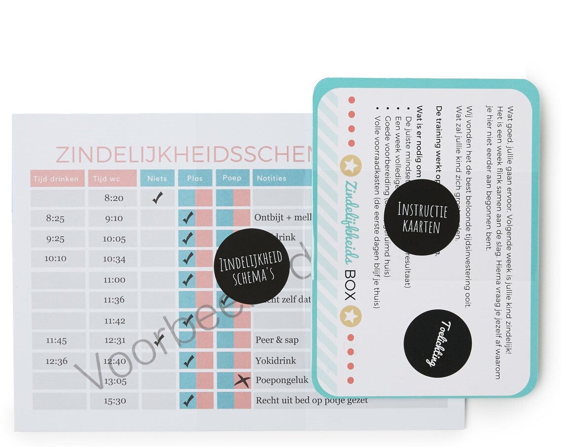 Het doosje van Zindelijkheidsbox bevat alle instructies die je nodig hebt om je zoon overdag zindelijk te leren worden. Stap voor stap wordt je in een coachende stijl uitgelegd hoe je het aanpakt. Wat je het beste kunt zeggen en doen. Dit zorgt ervoor dat je het volhoudt en het jullie lukt! Met de Zindelijkheidsbox maak je er een feestje van.