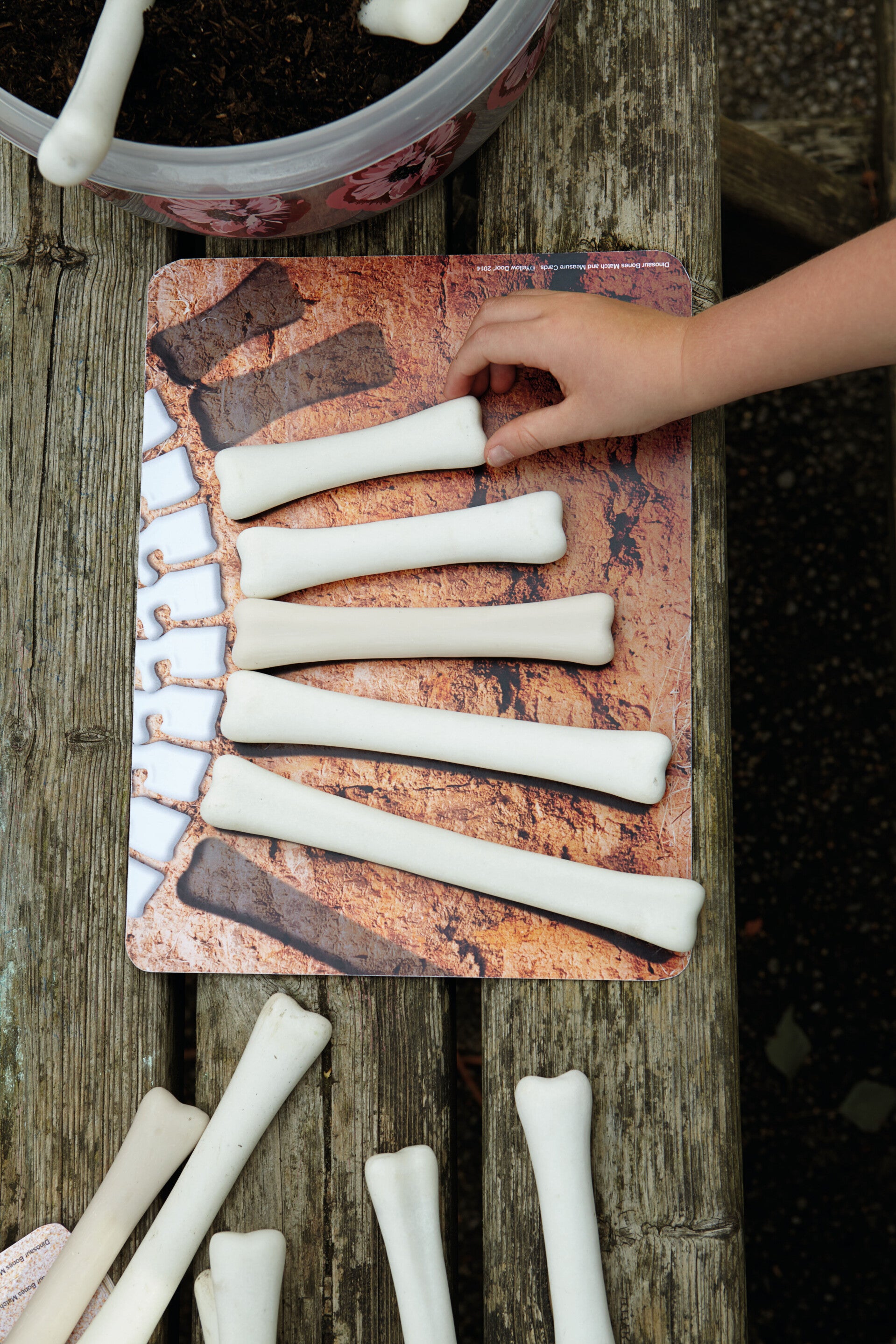Deze spannende activiteitenkaarten zijn ontworpen om naast de dinosaurusbotten te gebruiken en moedigen kinderen aan om de botten die ze ontdekken te matchen, tellen, vergelijken, ordenen en meten. De kaarten zijn gemaakt van duurzaam plastic en zijn sterk genoeg om buiten te gebruiken (inclusief waterspelen) terwijl kinderen de begraven botten ontdekken. Een speelse manier voor kinderen om hun eerste stappen in het meten te zetten.