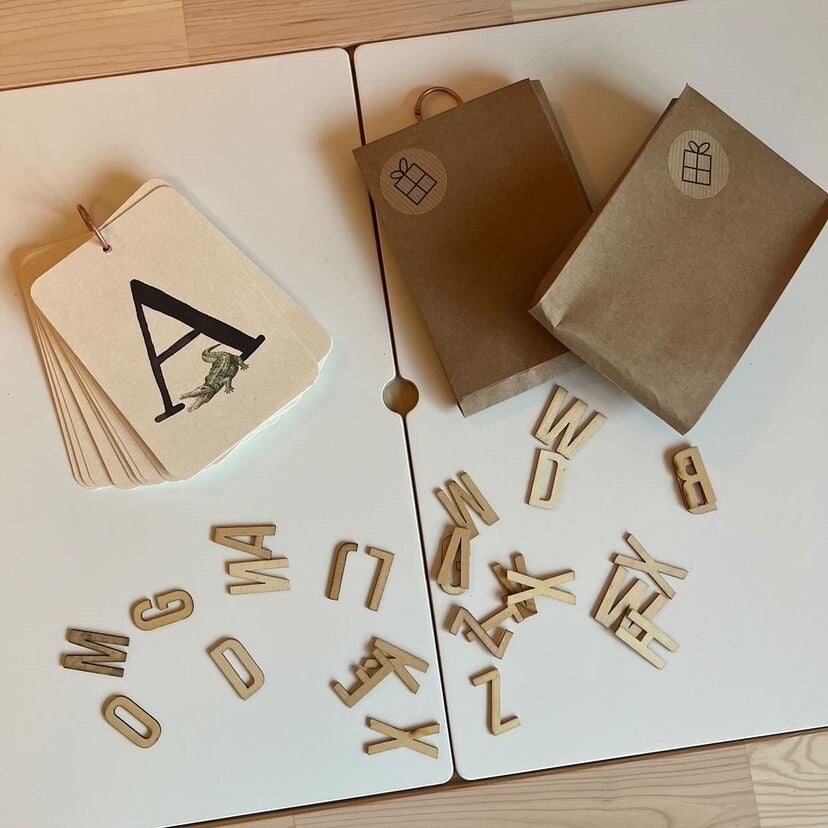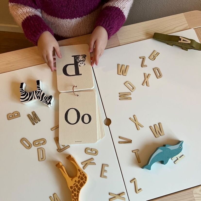 Een geweldige set flashcards van het alfabet met prachtige illustraties. Het alfabet is weergegeven in hoofd en kleine letters en is zowel in het Engels als het Nederlands te gebruiken. De kaarten hebben een messing ring om de kaarten stijlvol te bundelen