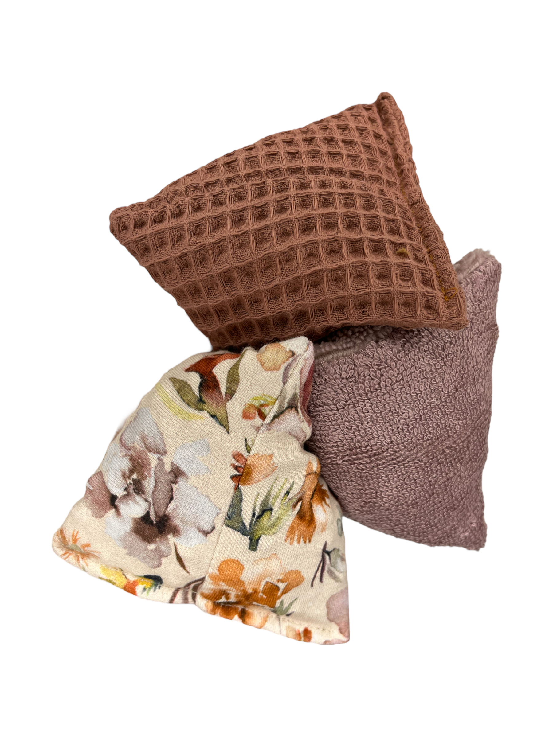 De driehoekjes kun je ook in de diepvries doen om te koelen, of even bevochtigen en 30 sec in de magnetron om te gebruiken als warmtezakje.