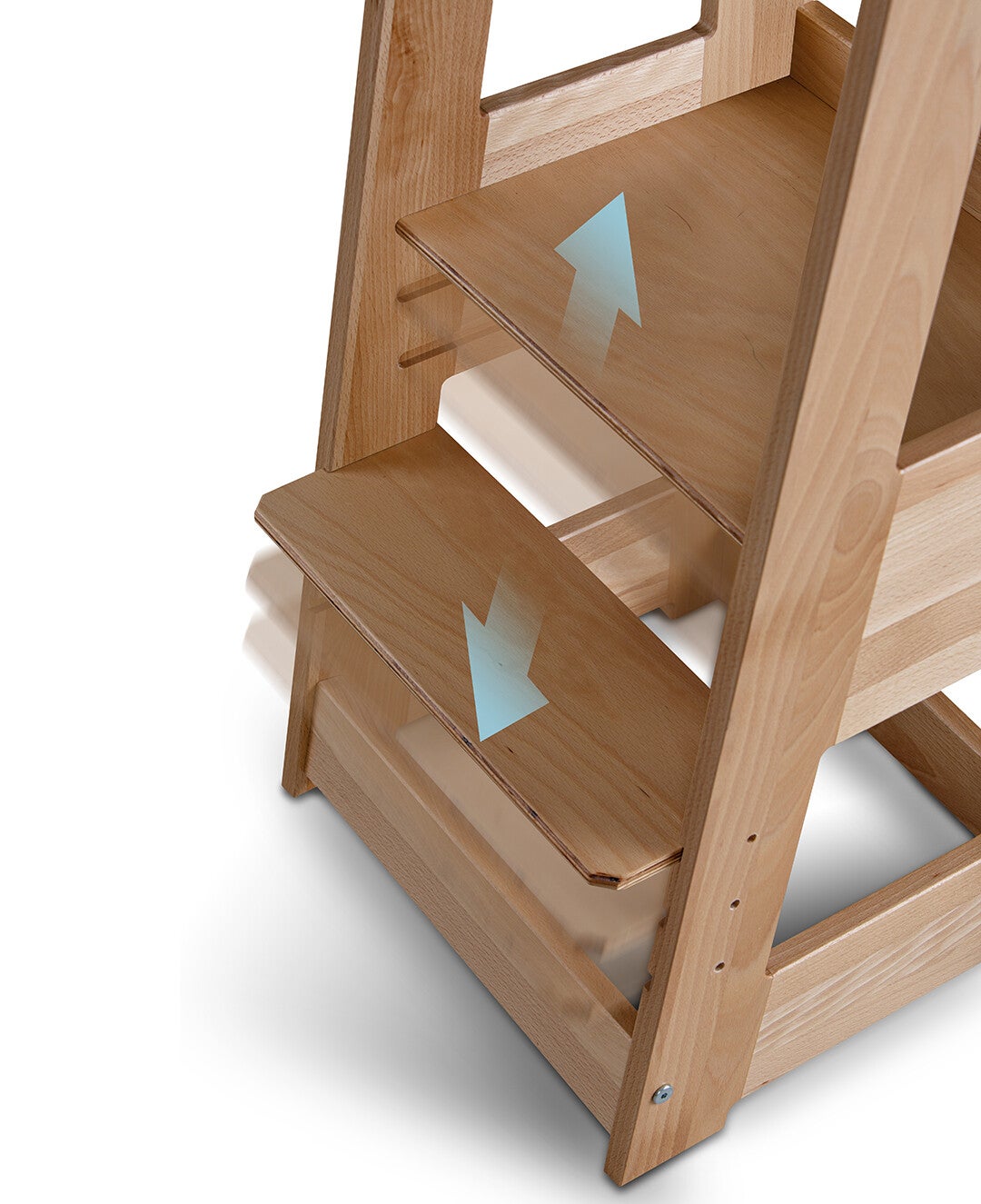 TiSsi® leertoren felix naturel, de ontdekkingstoren die met je meegroeit. De leertoren kan met een paar eenvoudige stappen optimaal worden aangepast aan de grootte van uw kind.