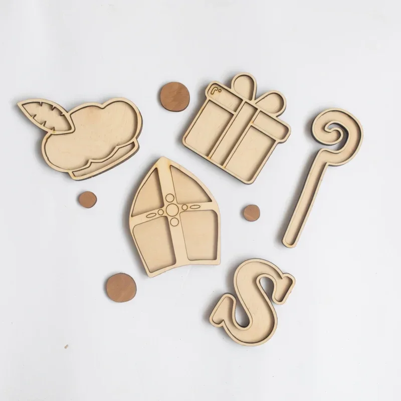 - Afmetingen: Pietenmuts: 9 x 9 cm, kado: 8 x 8 cm , mijter: 9,5 x 8 cm, choco letter: 7 x 5 cm, staf: 12,5 x 4,5 cm.