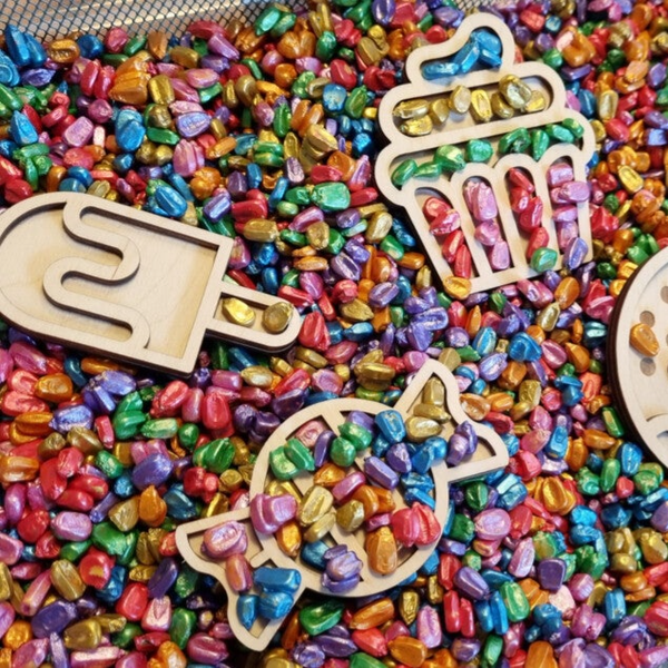 Een mooie baisis voor in speelbakken zijn deze sensorische parels in prachtige glanzende regenboogkleuren. Voeg er losse materialen aan toe en je hebt een sensorische speelset. Of sorteer de kleuren in de regenboog vulvorm!