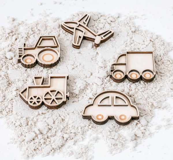 Een mooie set mini vulvormen van voertuigen. Past uitstekend bij sensorisch spel en is een mooie aanvulling voor bij de speelbak. Laat je kind deze vulvorm vullen met rijst, sensorische parels of andere materialen. Verder kun je er afdrukken mee maken in kinetisch zand.