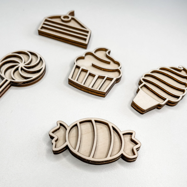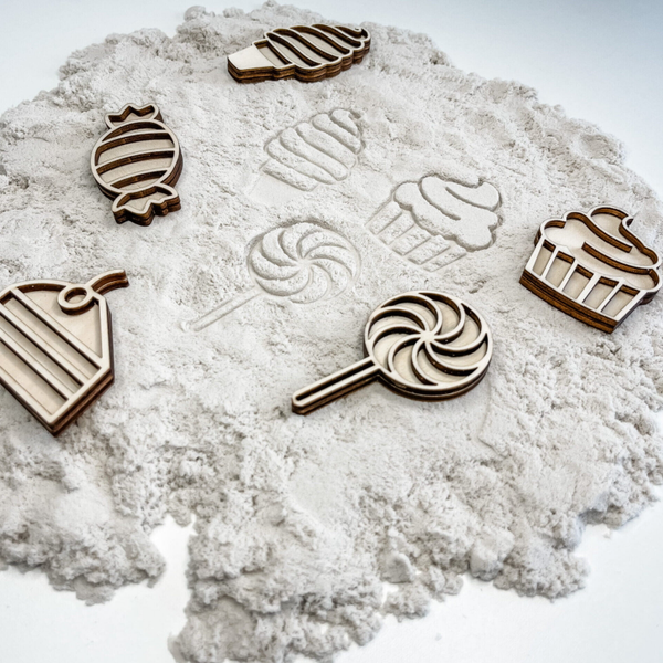 Een mooie set mini vulvormen van zoetigheid. Past uitstekend bij sensorisch spel en is een mooie aanvulling voor bij de speelbak. Laat je kind deze vulvorm vullen met rijst, sensorische parels of andere materialen. Verder kun je er afdrukken mee maken in kinetisch zand.