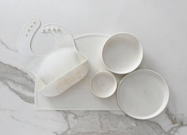 - Inhoud Gift set (5 siliconen items): Placemat, bord, slabber, kom groot en klein formaat.