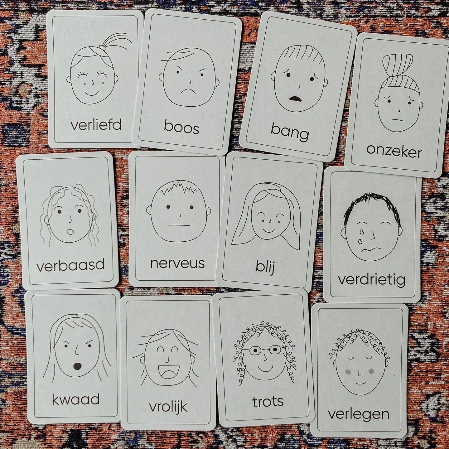 De set bestaat uit 12 dubbelzijdig bedrukte A6 kaarten met op de ene zijde de emotie met bijbehorende tekst. Op de andere zijde staat alleen de afbeelding.