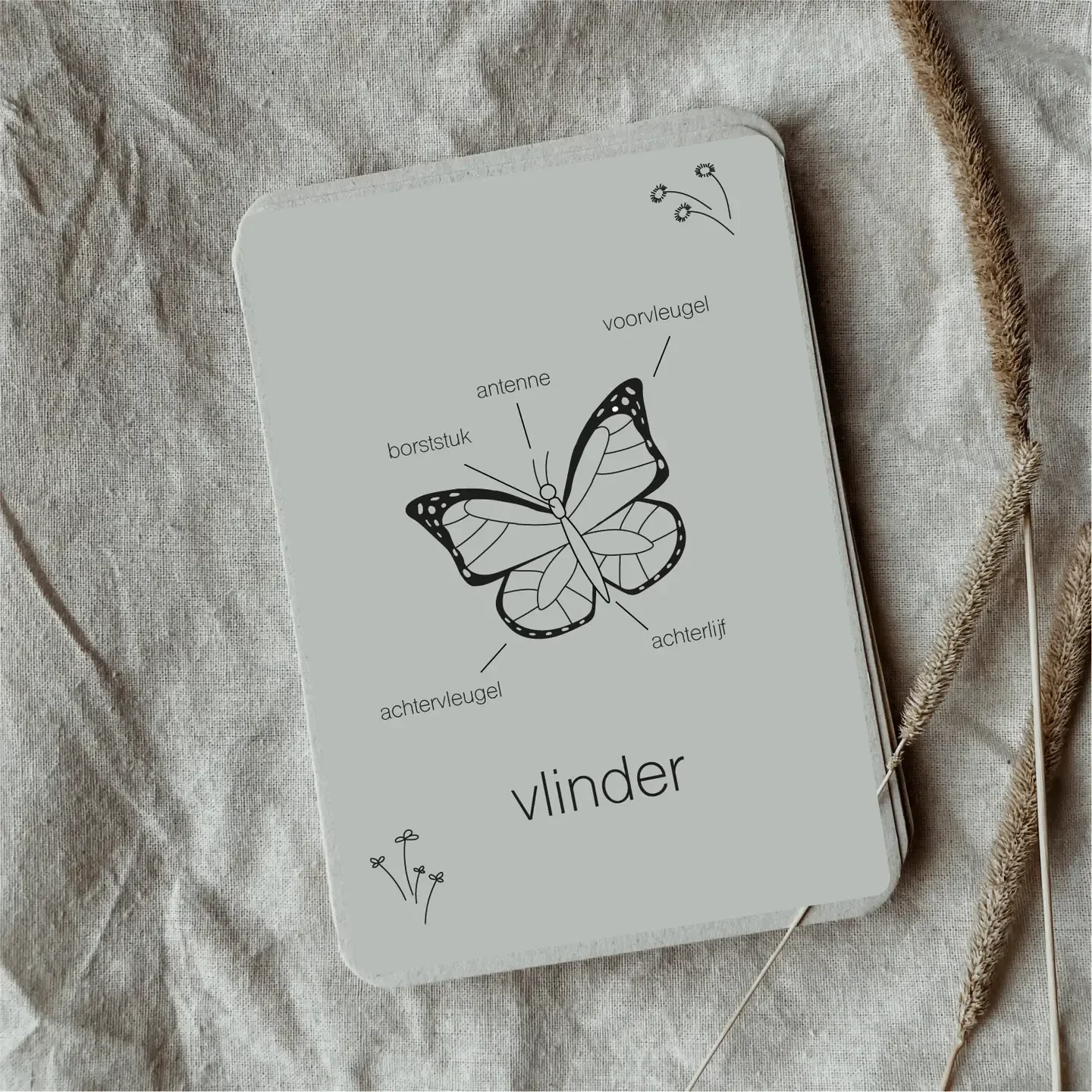 De set lifecycle flashcards bestaat uit 6 dubbelzijdig bedrukte kaarten op A6 formaat met de levenscyclus van een vlinder. De levenscyclus is afgebeeld als geheel en tevens op vier losse kaarten, zodat kinderen de kaarten op volgorde kunnen leggen om spelenderwijs kennis te maken met de groei van de natuur. Verder zit er ook een kaart met de anatomie van de vlinder bij.