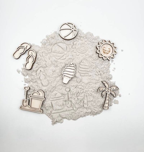 Een mooie set mini vulvormen in het thema Strand. Past uitstekend bij sensorisch spel en is een mooie aanvulling voor bij de speelbak. Laat je kind deze vulvorm vullen met rijst, sensorische parels of andere materialen. Verder kun je er afdrukken mee maken in kinetisch zand.