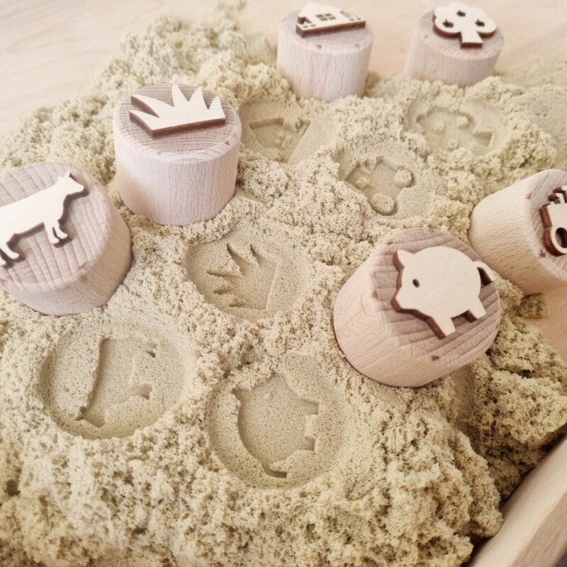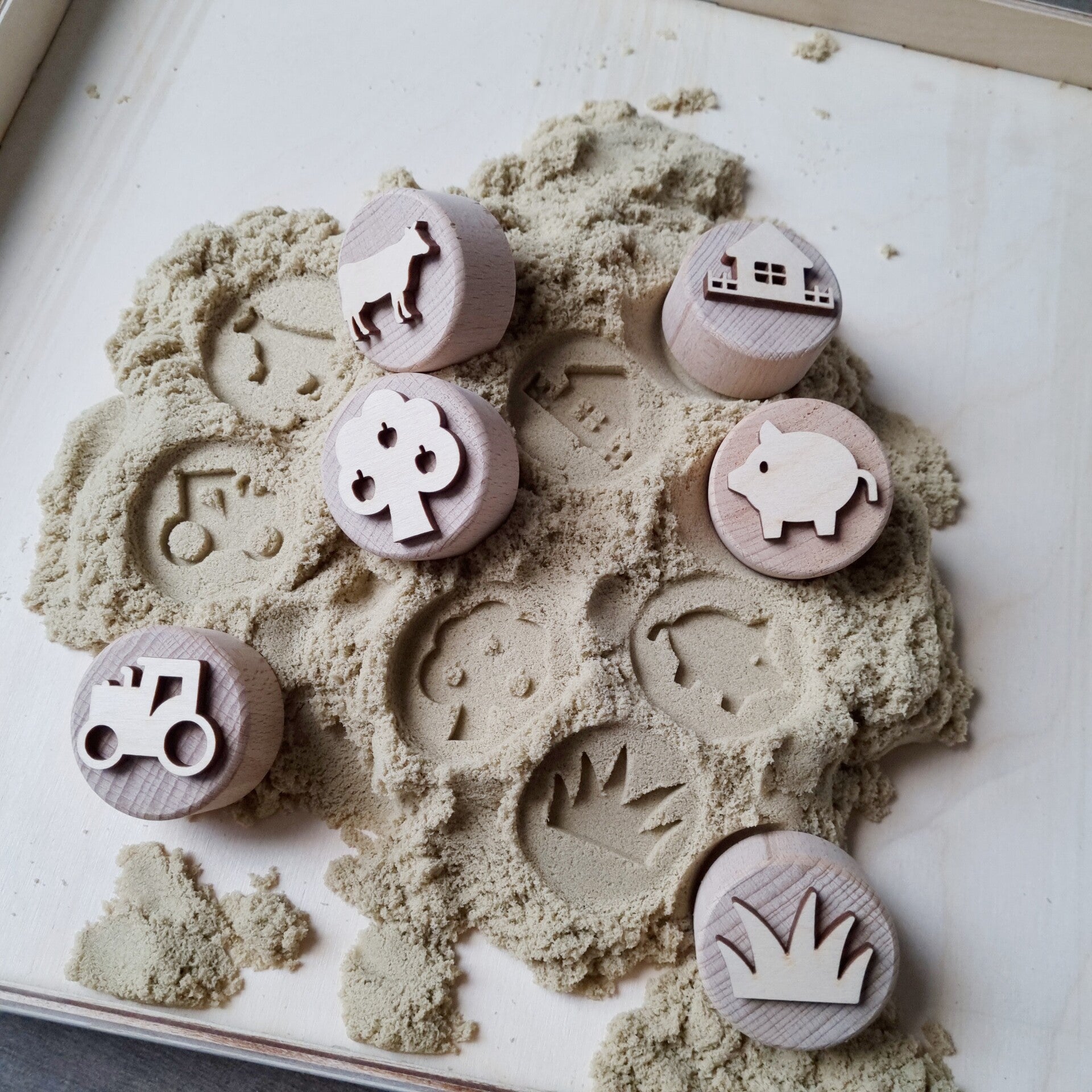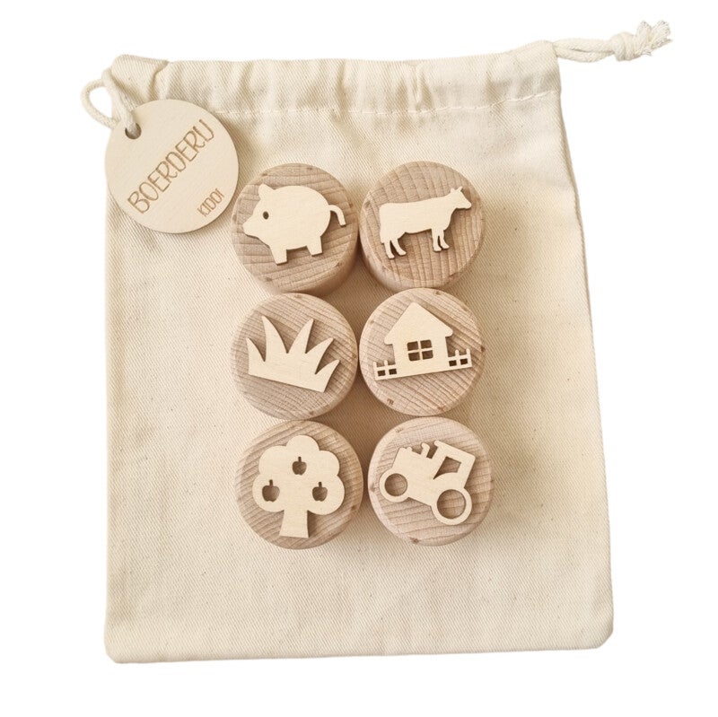 Wat een stoere en robuuste set, deze houten stempels in het boerderij thema. Met de stempels van de koe, gras, appelboom, trekker, varken en huisje kun je een boerderij gaan stempelen. Te gebruiken in kinetisch zand en klei.